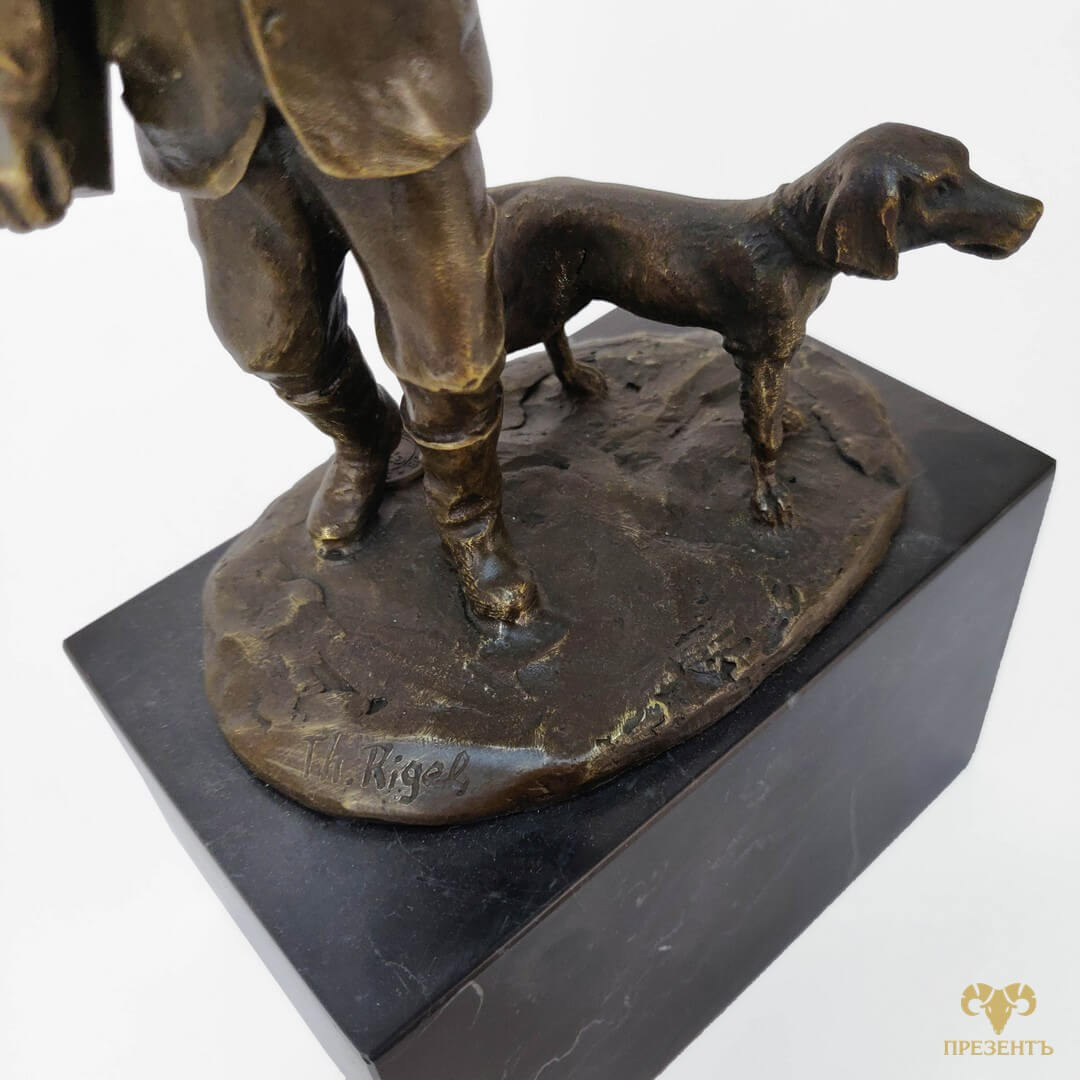 Бронзовая скульптура Охотник и собака — прекрасный вариант для подарка мужчине-коллекционеру антикварных вещей, охотнику. На статуэтке есть подпись Th. Rigel, и медальон «FONDERIE BORDS DE SEINE», подтверждающий высокое качество бронзового литья.