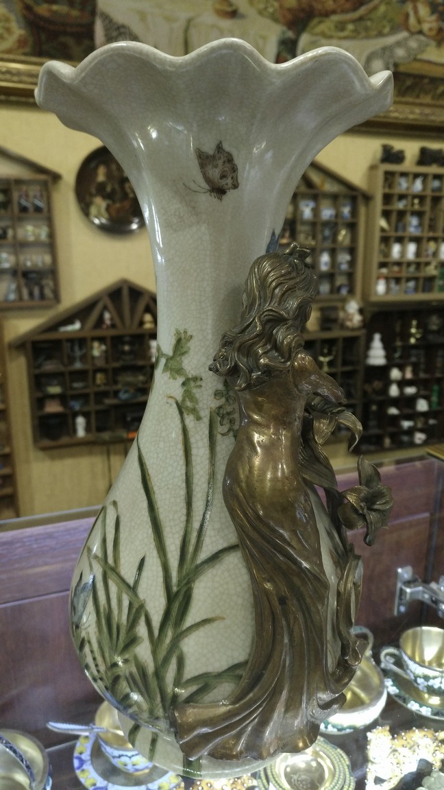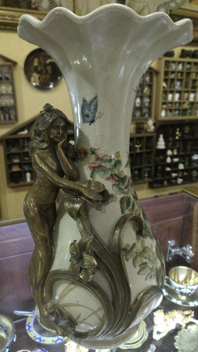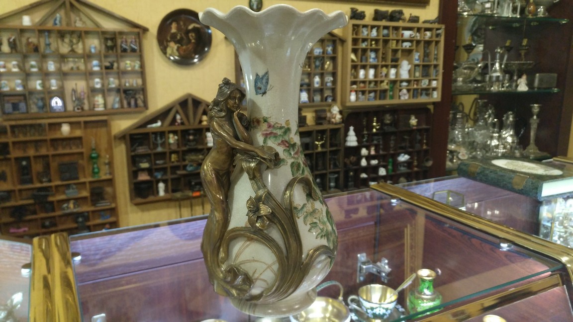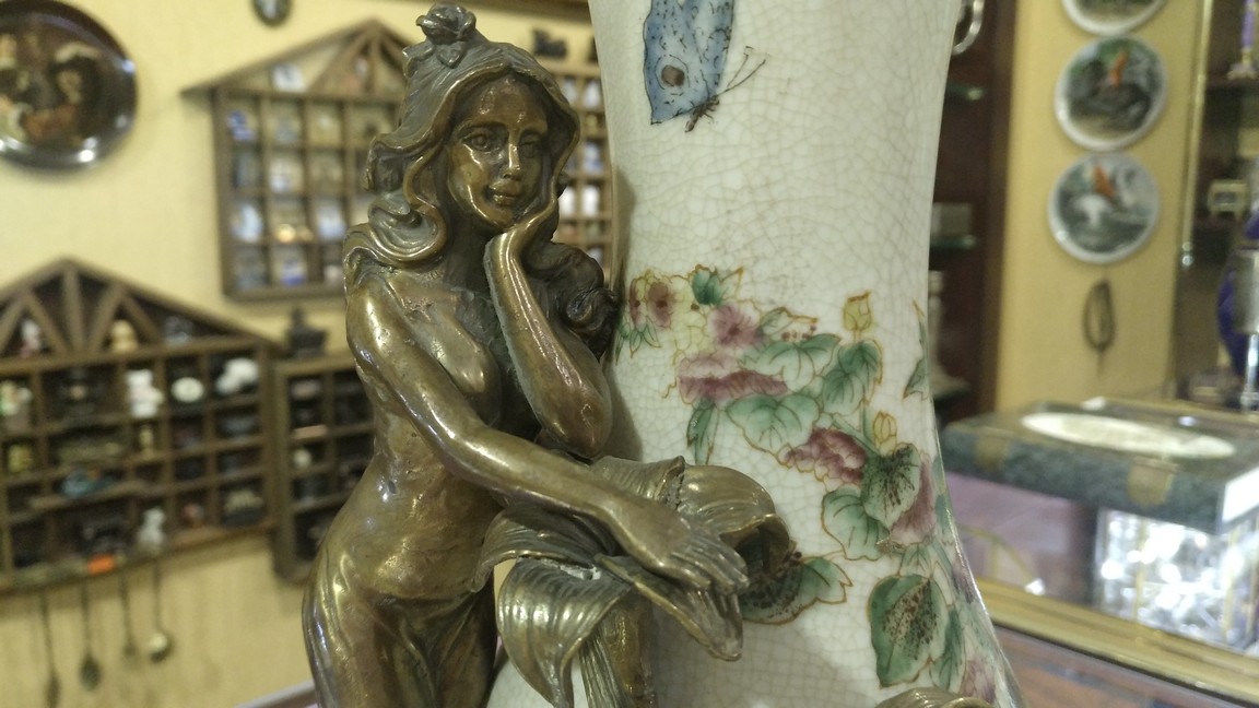 Антиквариат. Расписная ваза с изображением девушки и цветов, обвивающих низ вазы (бронза).  Оригинальные подарки, купленные у нас, способны удивить каждого. Элитная посуда, картины, бронзовые статуи — все это может порадовать любого коллекционера. Продажа антиквариата, дело, которым мы занимаемся не первый год, мы гарантируем, Вы останетесь довольны покупкой в интернет-магазине «ПРЕЗЕНТЪ»