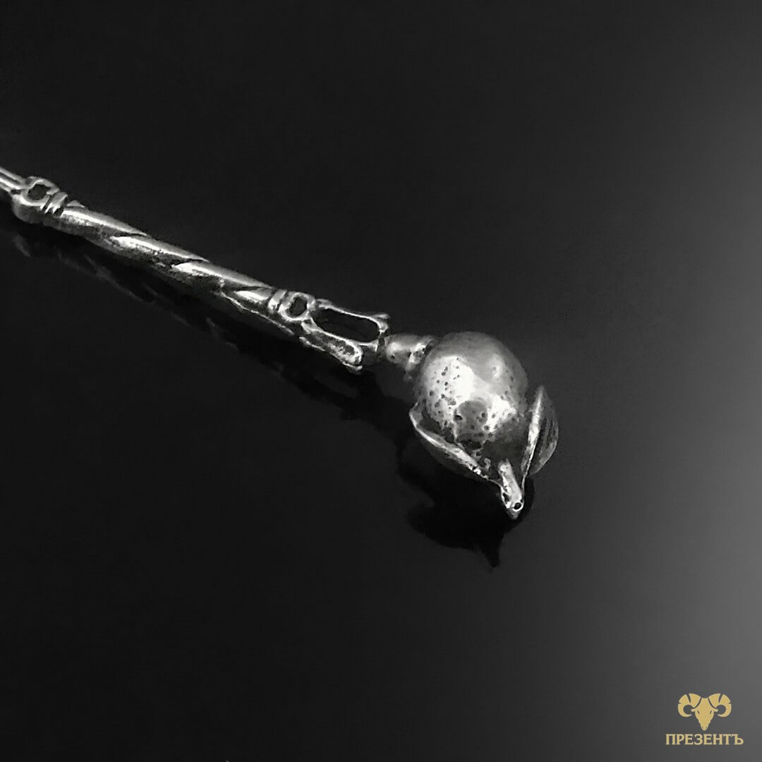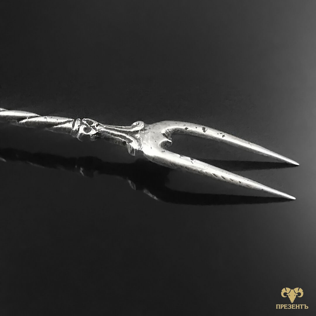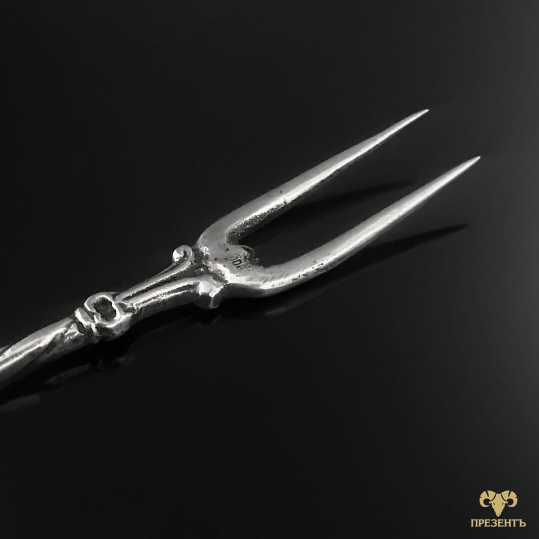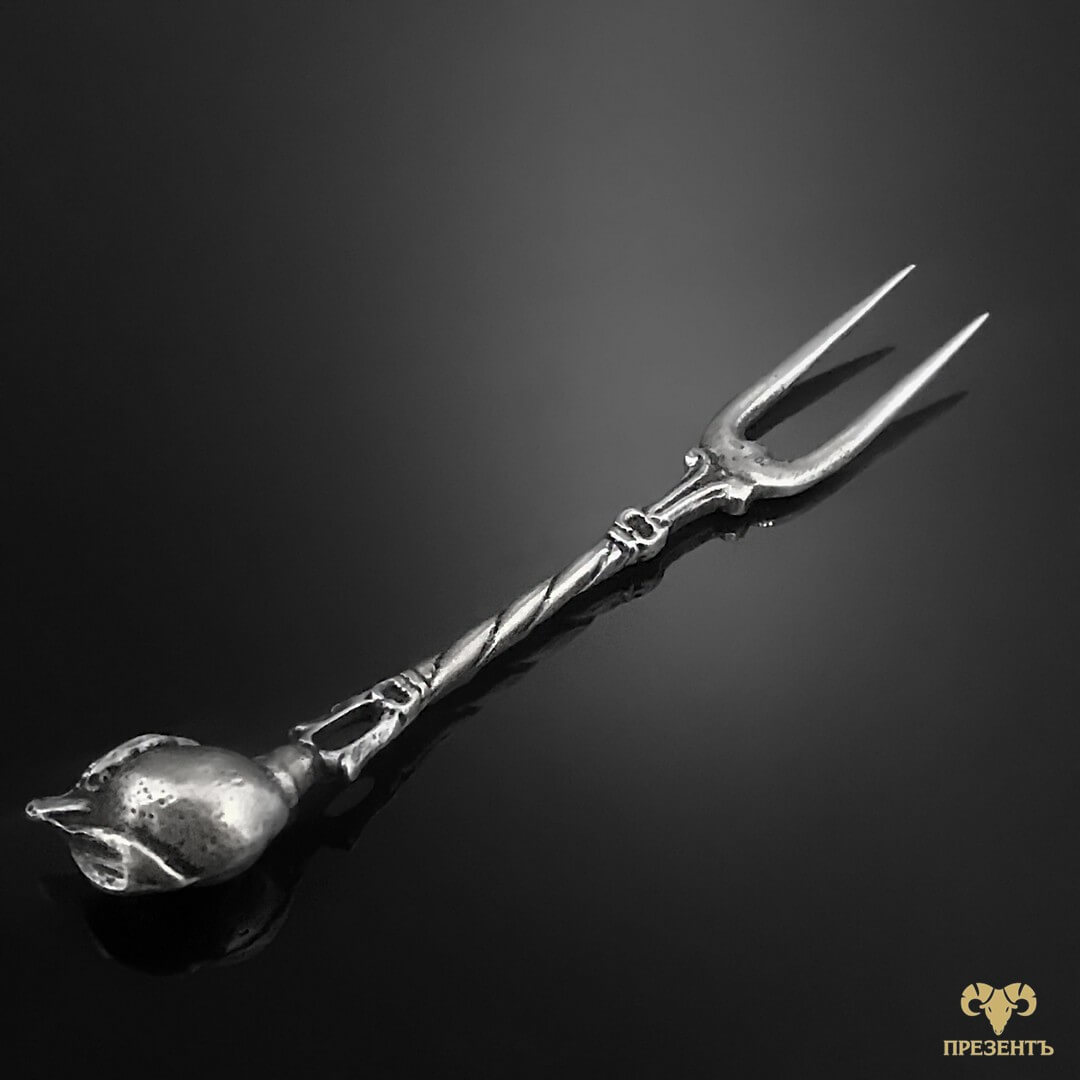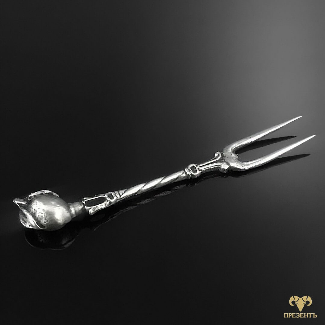 Серебряная вилка для лимона. Такую вилку принято подавать с нарезанными яблоками, ягодами, апельсинами, а также консервированными фруктами. Серебряная, красиво декорированная вилка, с двумя зубцами, станет отличным вариантом подарка для настоящего кулинара или повара. Такая необычная вилка может дополнить коллекцию редких столовых приборов и просто украсить интерьер кухни.