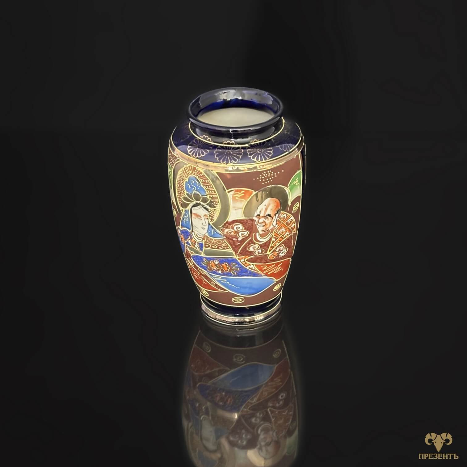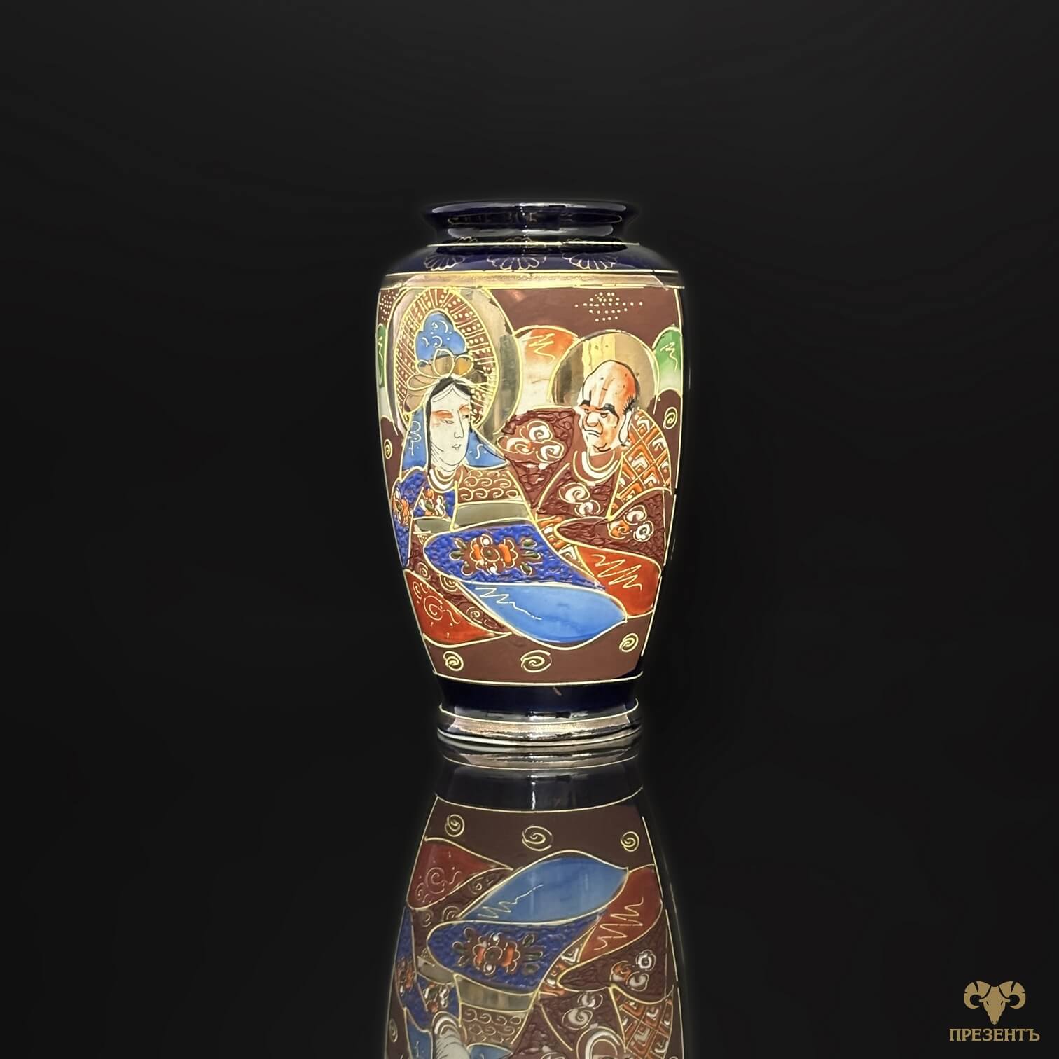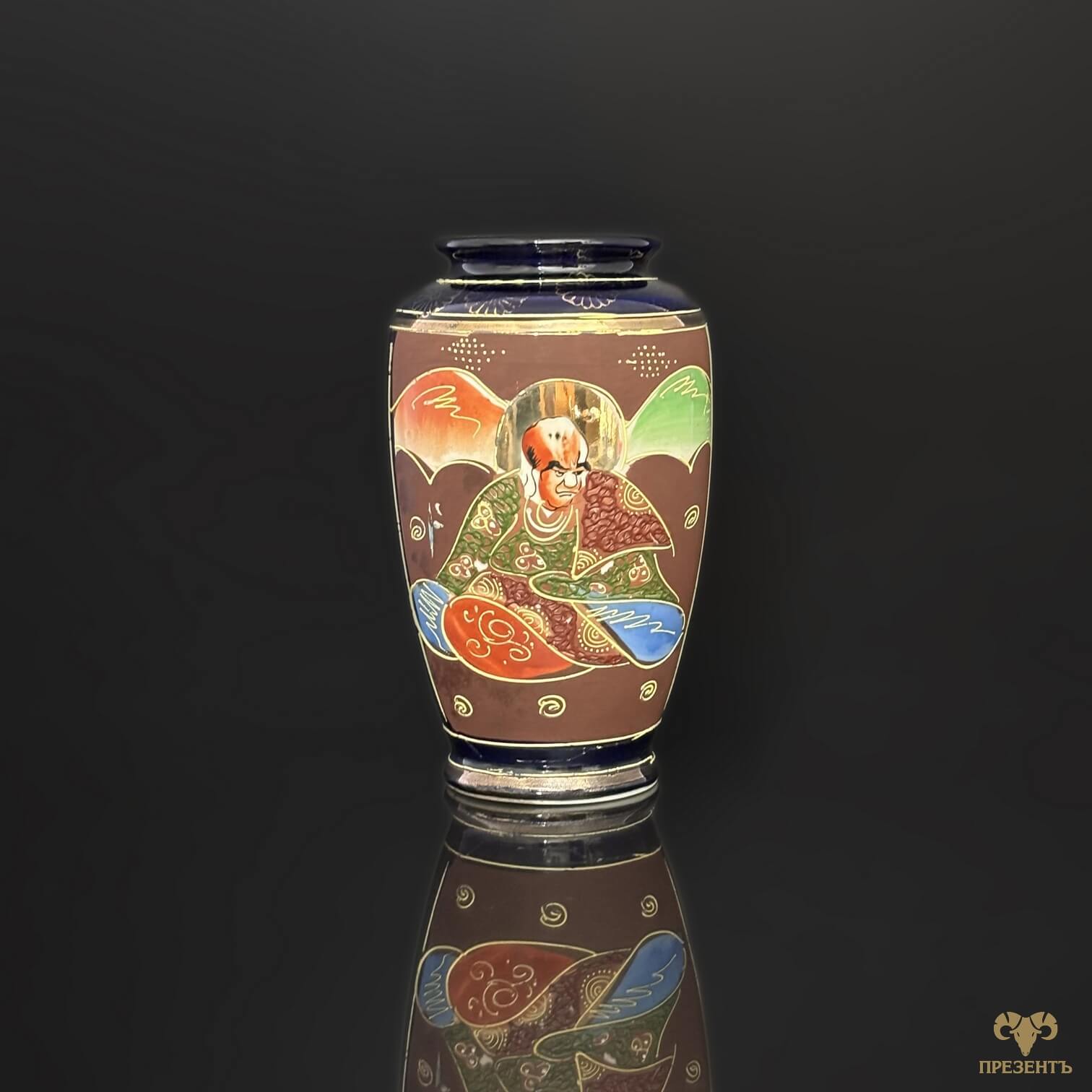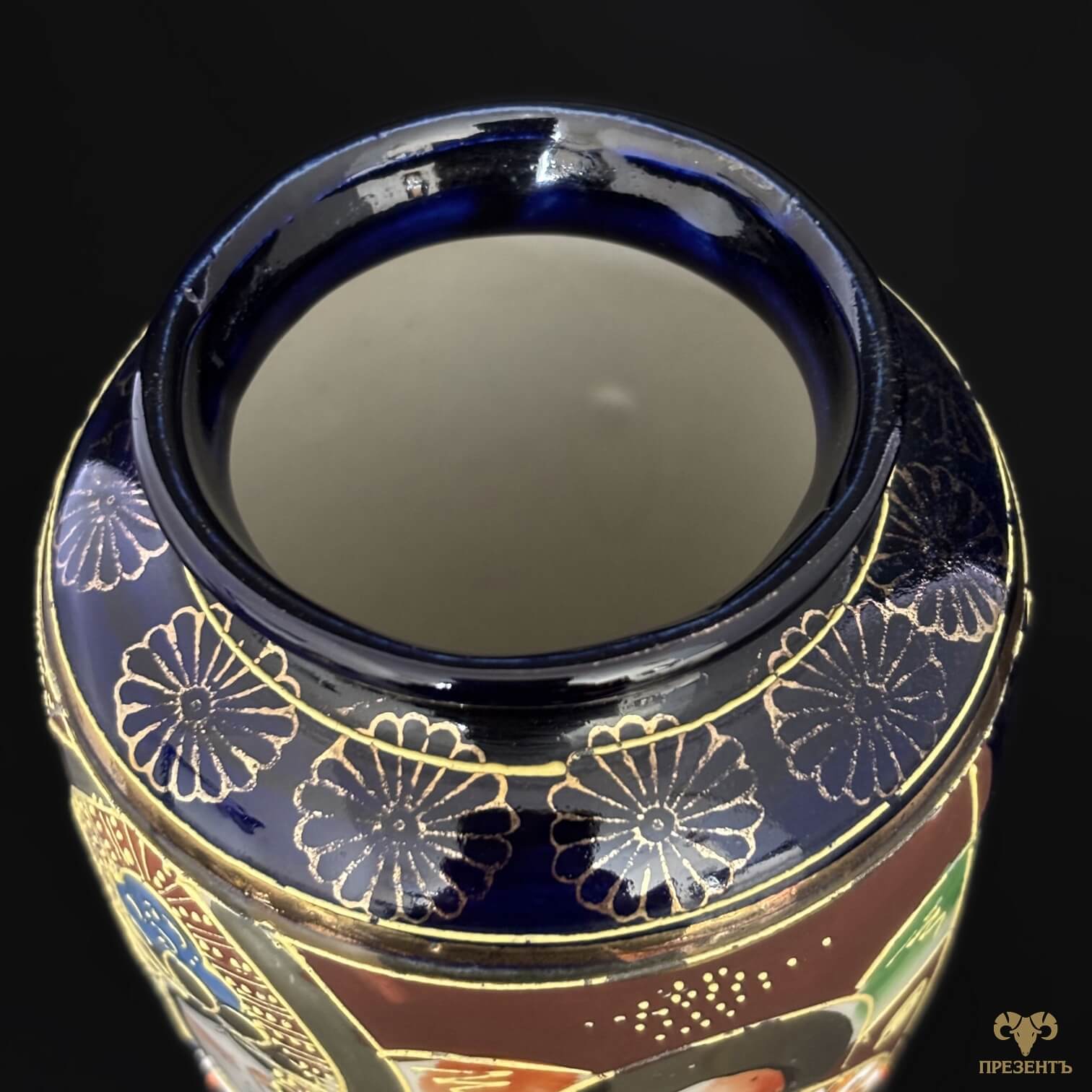 Сюжет на вазе отражает сцены из японской культуры: изображены благородные воины-самураи в традиционных кимоно, окруженные декоративными орнаментами и золотыми деталями. Каждая линия, каждый элемент орнамента выполнены вручную, что делает эту вазу уникальной.