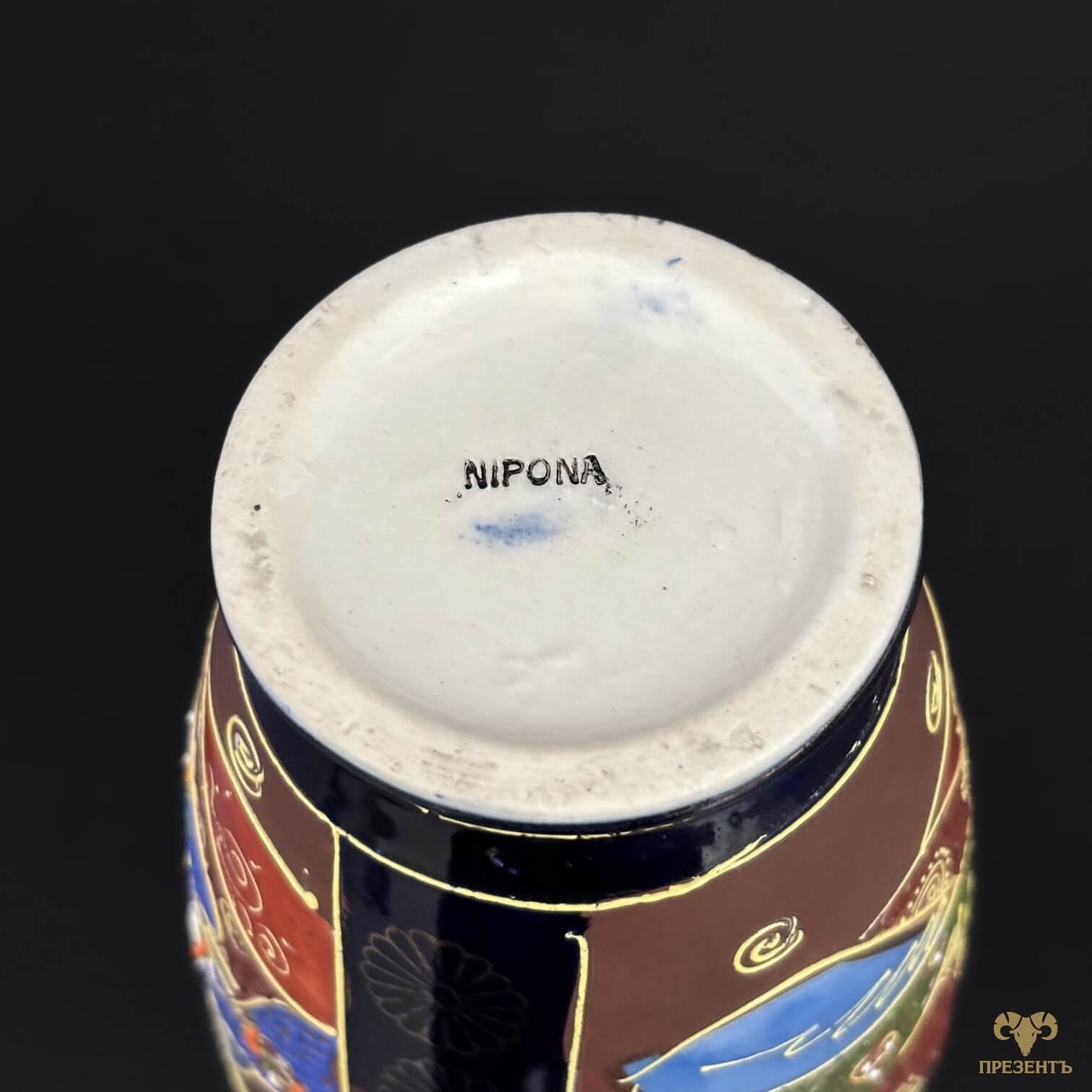 На донышке вазы стоит клеймо NIPONA, которое указывает на японское происхождение изделия. Вазу можно использовать как самостоятельный декоративный предмет, элемент восточного интерьера или ценный объект для коллекции.