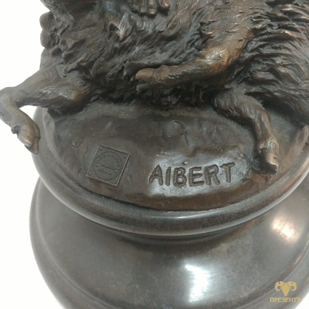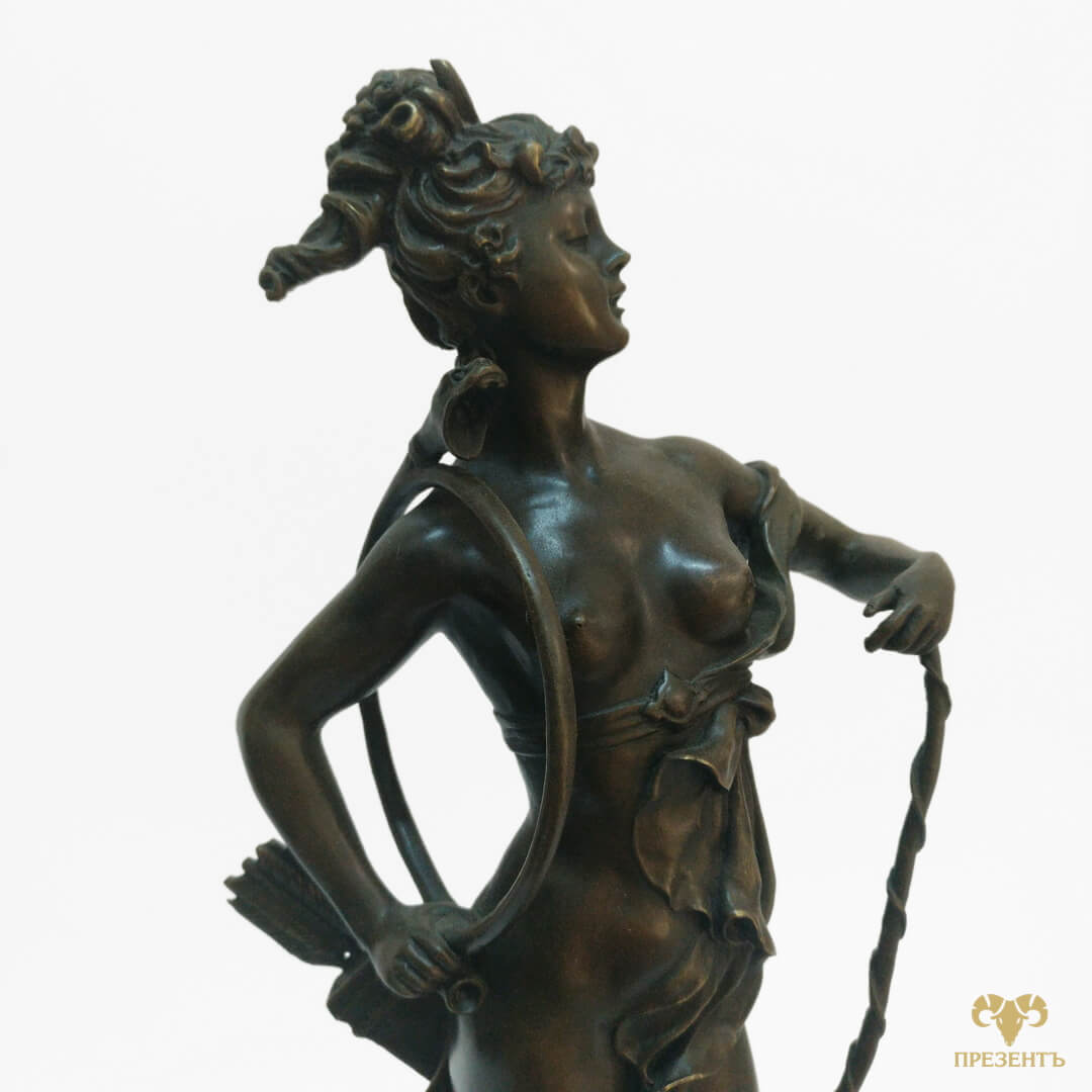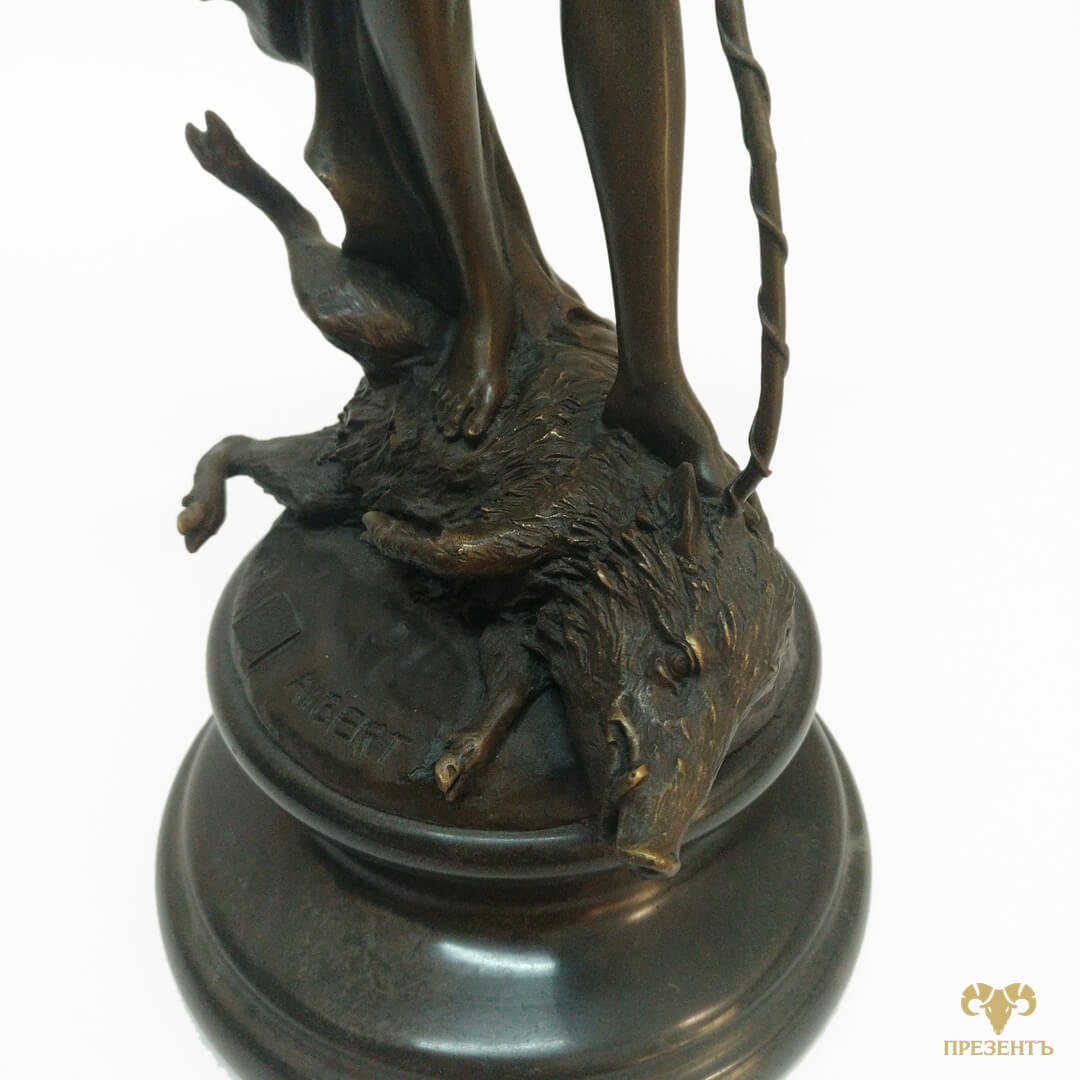 Утонченная фигура богини расположилась на мраморном постаменте, у ее ног побежденный кабан, как символ удачной охоты. Высокое мастерство французских бронзовых литейщиков подтверждает медальон на фигуре — L’Art Bronze Qualite France. Также на статуэтке указан автор ALBERT, работа которого и вдохновила литейщиков на создание данной скульптуры богини Дианы (Артемиды).