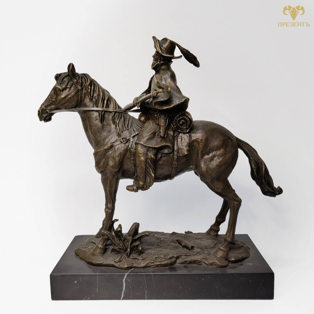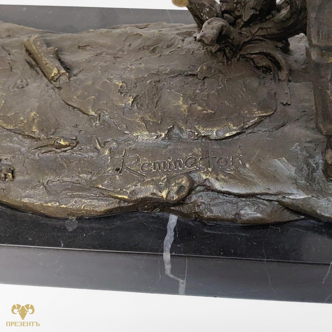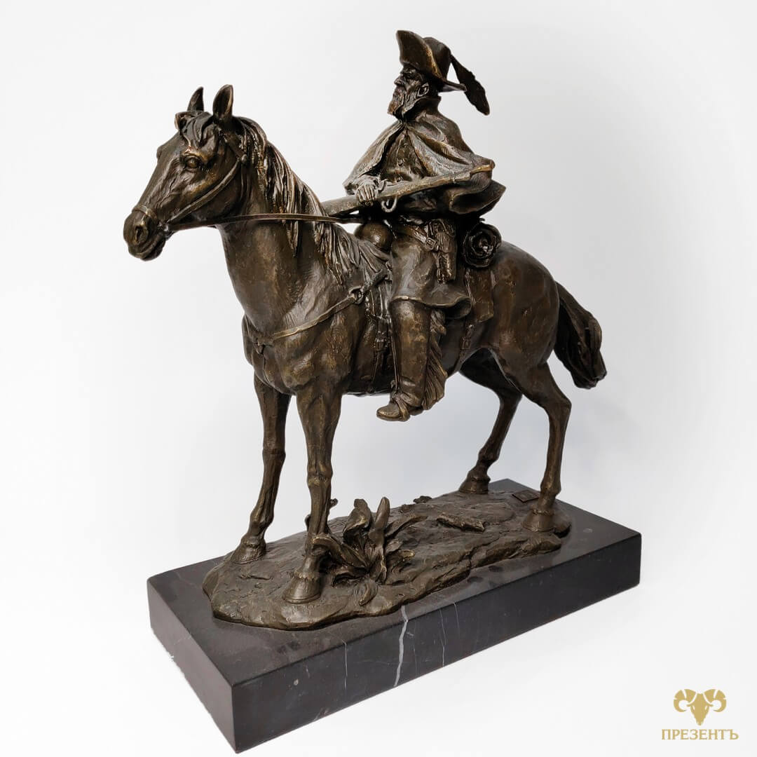 Бронзовая скульптура Дон Кихот — достойный подарок для поклонника творчества Сервантеса и не только. Уверены , как литератор, так и психолог или философ будет доволен такому подарку. Бронзовая статуэтка Дон Кихот отлично впишется и в охотничий домик, и в кабинет большого начальника. И смысл и исполнение этого великолепия не оставит обладателя хорошего эстетического вкуса равнодушным. На статуэтке указано имя автора Remington и медальон L’ART BRONZE QUALITE FRANCE, подтверждающий высокое качество бронзового литья. Фредерик Ремингтон (1861-1909) -американец, один из лучших скульпторов всех веков и народов.