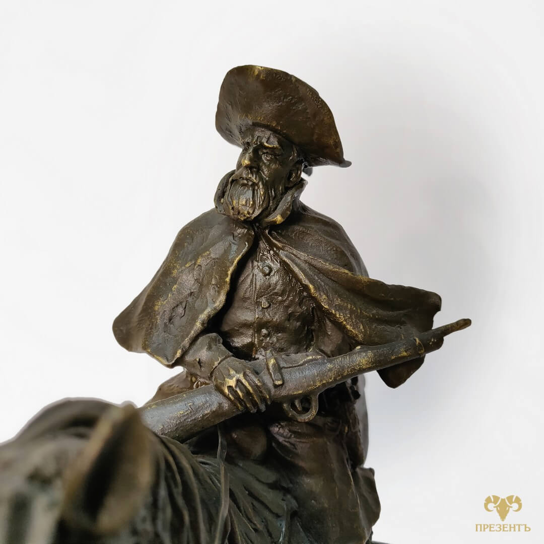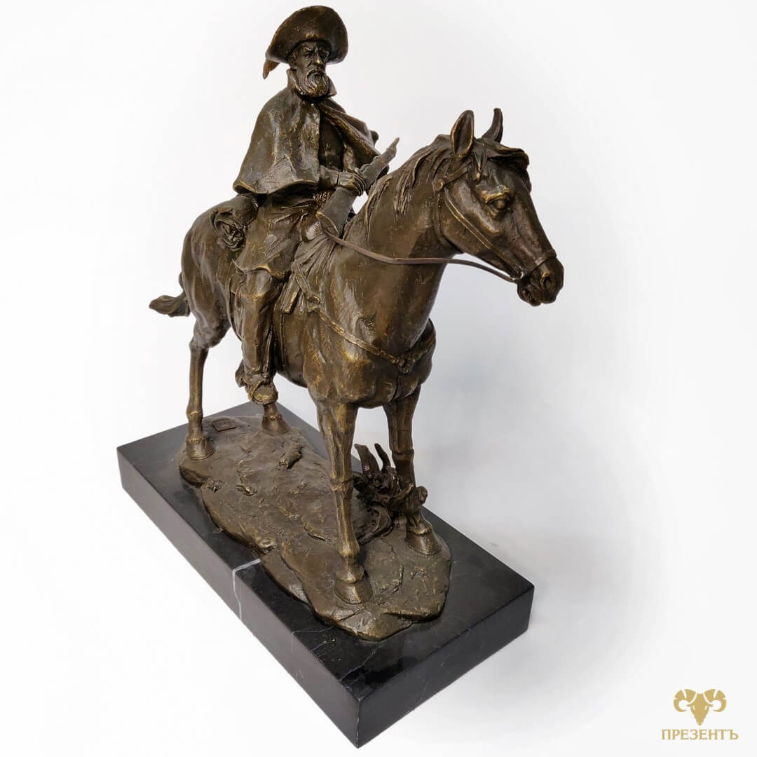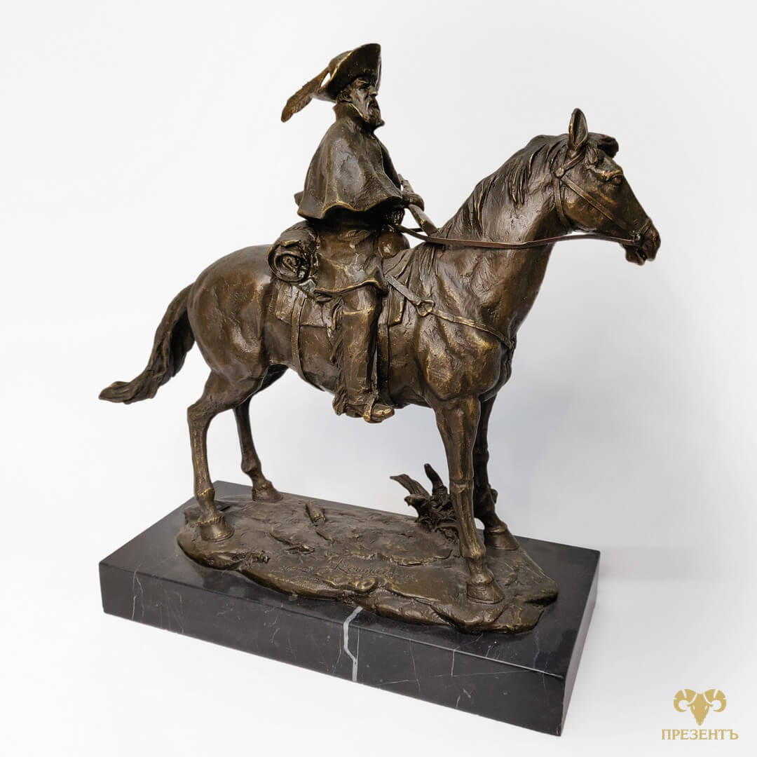 Бронзовая скульптура Дон Кихот — достойный подарок для поклонника творчества Сервантеса и не только. Уверены , как литератор, так и психолог или философ будет доволен такому подарку. Бронзовая статуэтка Дон Кихот отлично впишется и в охотничий домик, и в кабинет большого начальника. И смысл и исполнение этого великолепия не оставит обладателя хорошего эстетического вкуса равнодушным. На статуэтке указано имя автора Remington и медальон L’ART BRONZE QUALITE FRANCE, подтверждающий высокое качество бронзового литья. Фредерик Ремингтон (1861-1909) -американец, один из лучших скульпторов всех веков и народов.