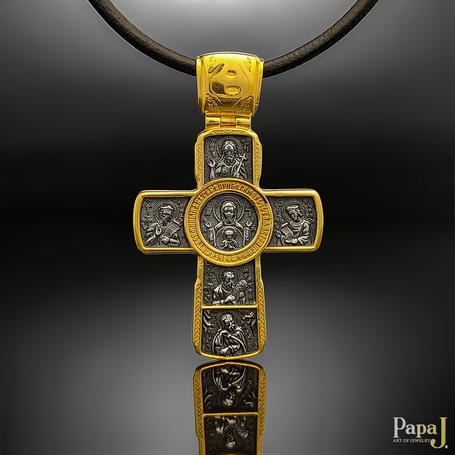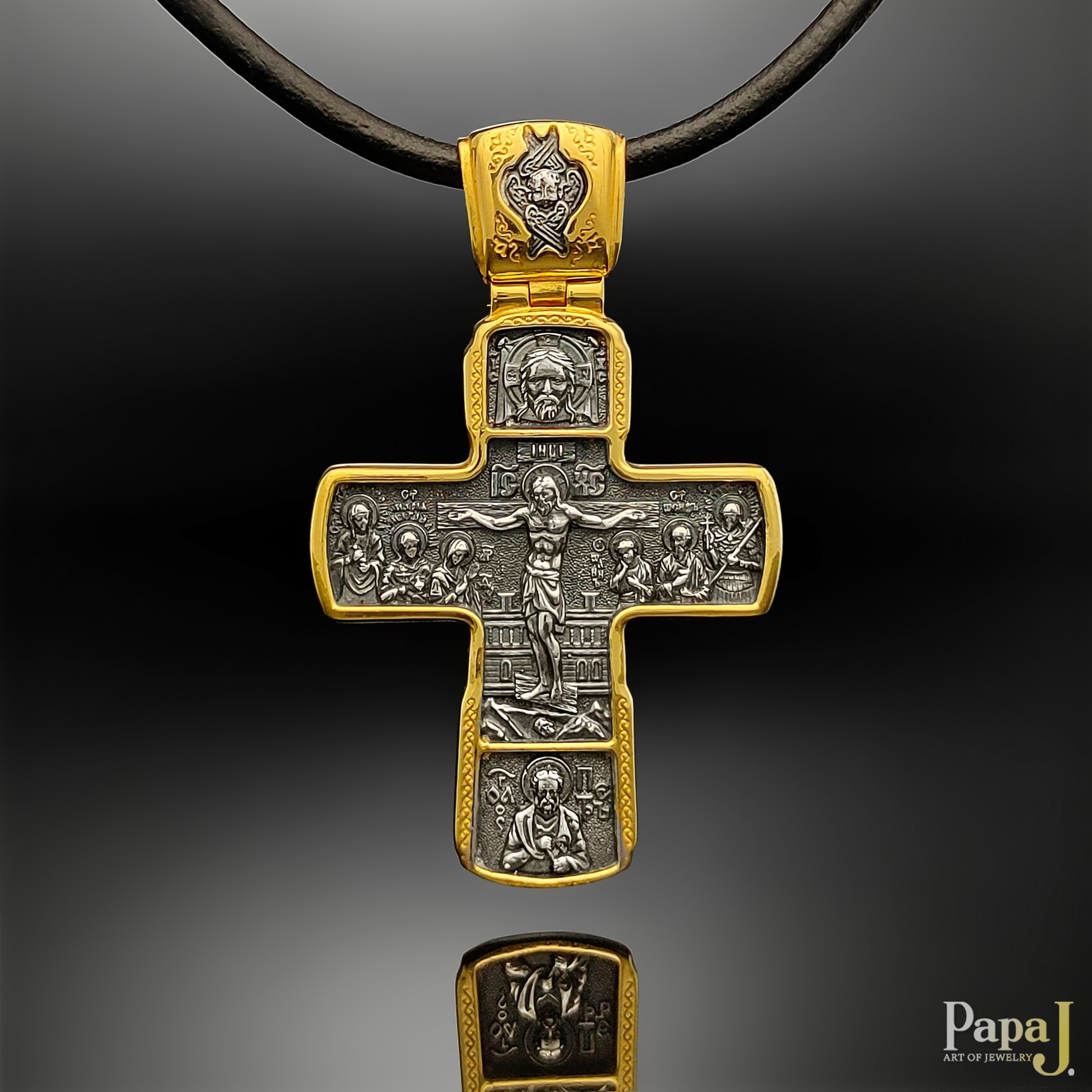 Этот православный крест изготовлен из серебра 925 пробы и украшен позолотой 999 пробы и чернением.