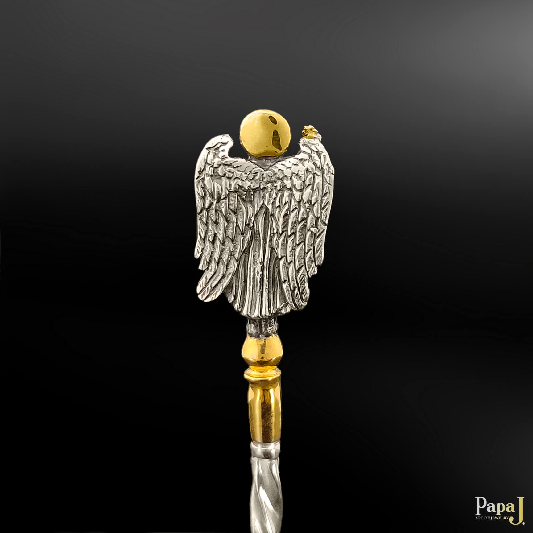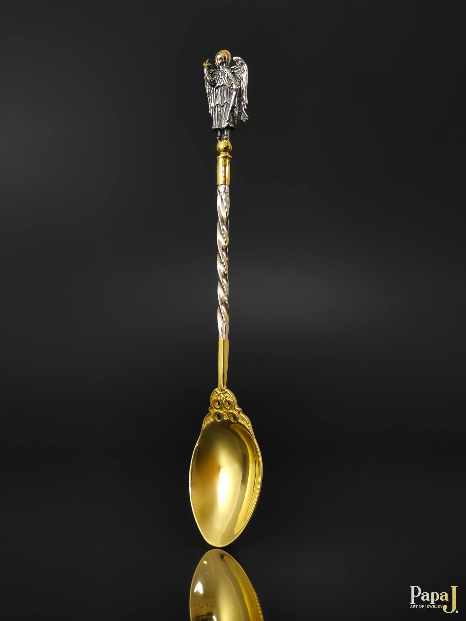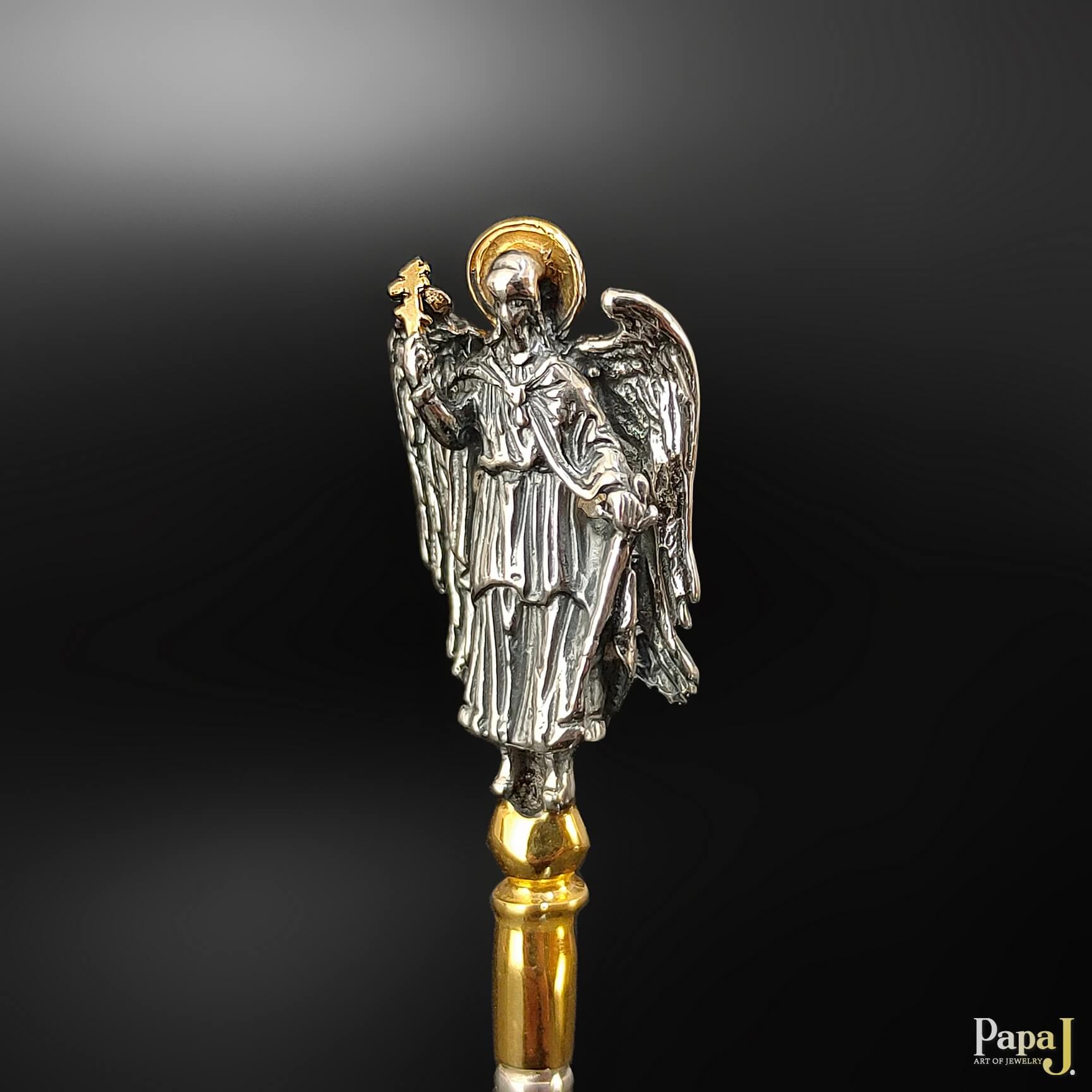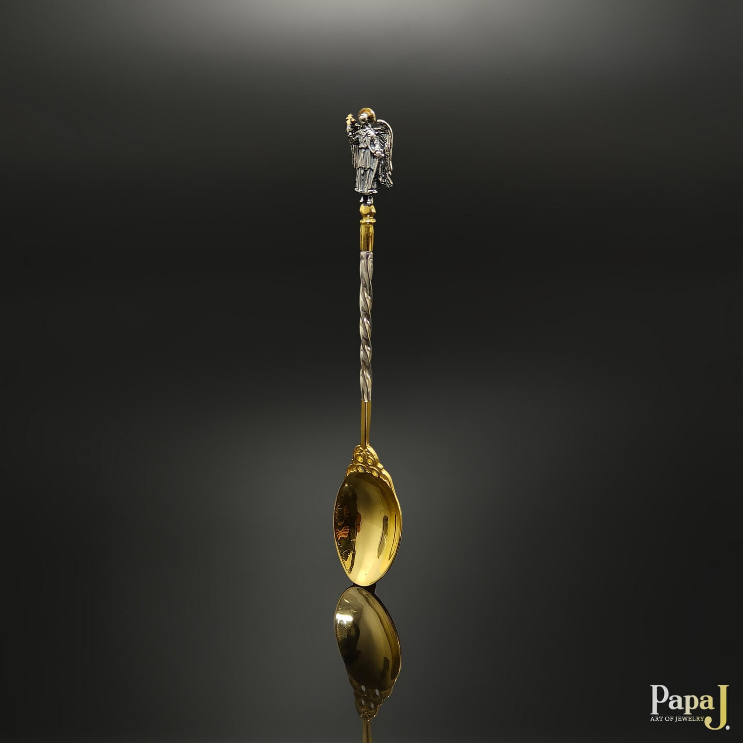 Элегантная ложка из серебра 925 пробы, украшенная изысканной позолотой 999 пробы и мастерским чернением. Рукоять венчает объёмная фигурка Ангела-хранителя с позолоченным нимбом, держащего крест – символ духовной защиты и мудрости.
