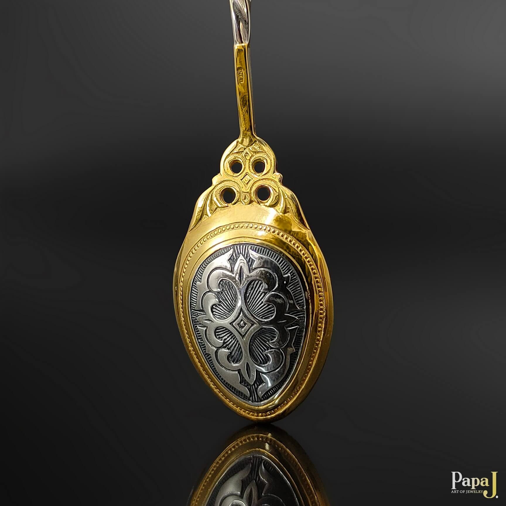 Чаша ложки снаружи инкрустирована тончайшим серебряным узором, подчеркнутым чернением, создавая эффект утончённого антикварного изделия. Внутренняя поверхность покрыта сияющей позолотой, что не только придаёт изысканный внешний вид, но и символизирует чистоту и благословение.